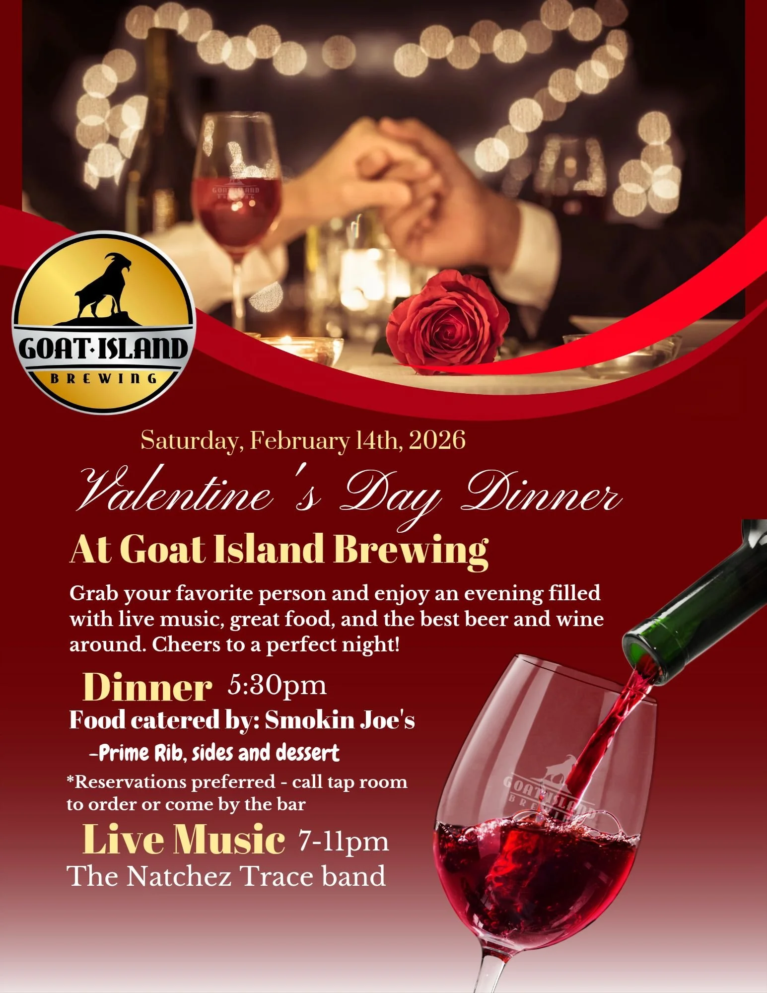 Dinner 5:30pm - Food catered by Smokin Joe’s - Prime Rib, sides and desert.